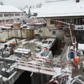 Vom 10. Februar an wurde die Fabrikation für vier Monate unterbrochen. In drei intensiven Wochen wurden unter Eigenregie die alten Käsereieinrichtungen demontiert und ausgebaut. Zusätzlich mussten die Boden- und Wandbeläge in der alten Käserei abgespitzt werden. Bei den wöchentlichen Sitzungen (Bauausschuss/Bauführer) wurden die Arbeiten und Aufträge laufend überwacht und vergeben. Simon Duppenthaler legte praktisch jeden Tag selber Hand an. Er war immer präsent, um allfällige Entscheidungen zu treffen. Interessant waren die etlichen Bausitzungen. Bei Diskussionen über das Fliessschema (Steuerung – glich einem Schnittmuster), verstanden wir eher „Bahnhof“. Andererseits konnten wir bei einer Vergabe (grosser Auftrag) die Rabattprozente selber vorgeben. Eine Deckenschalung in Metall oder Holz (Auftrag 3’000.-) beschäftigte uns und den Bauführer mehrere Wochen. Auch die Bestimmung der Fassadenfarbe hatte es in sich. Zwei Bündel Farbvorschläge in RAL genügten nicht. Eine Person der Denkmalpflege brachte noch einmal 2 Bündel mit einer anderen Bezeichnung (EU konform?) ins Spiel und noch länger liess der Entscheid von Bern auf sich warten.